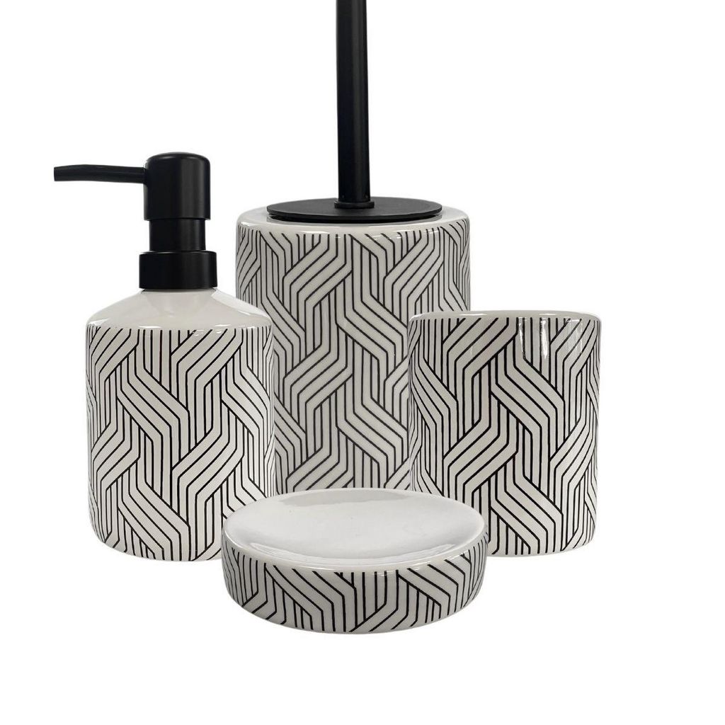 Ce produit est un ensemble d'accessoires de salle de bain en céramique, au design graphique noir et blanc, qui apportera une touche moderne, sophistiquée et minimaliste à votre espace.