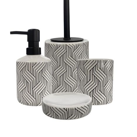 Set de salle de bain blanc - URBAIN - LEVASSEURCe produit est un ensemble d'accessoires de salle de bain en céramique, au design graphique noir et blanc, qui apportera une touche moderne, sophistiquée et minimaliste à votre espace.Le motif est composé de lignes noires formant un motif géométrique en