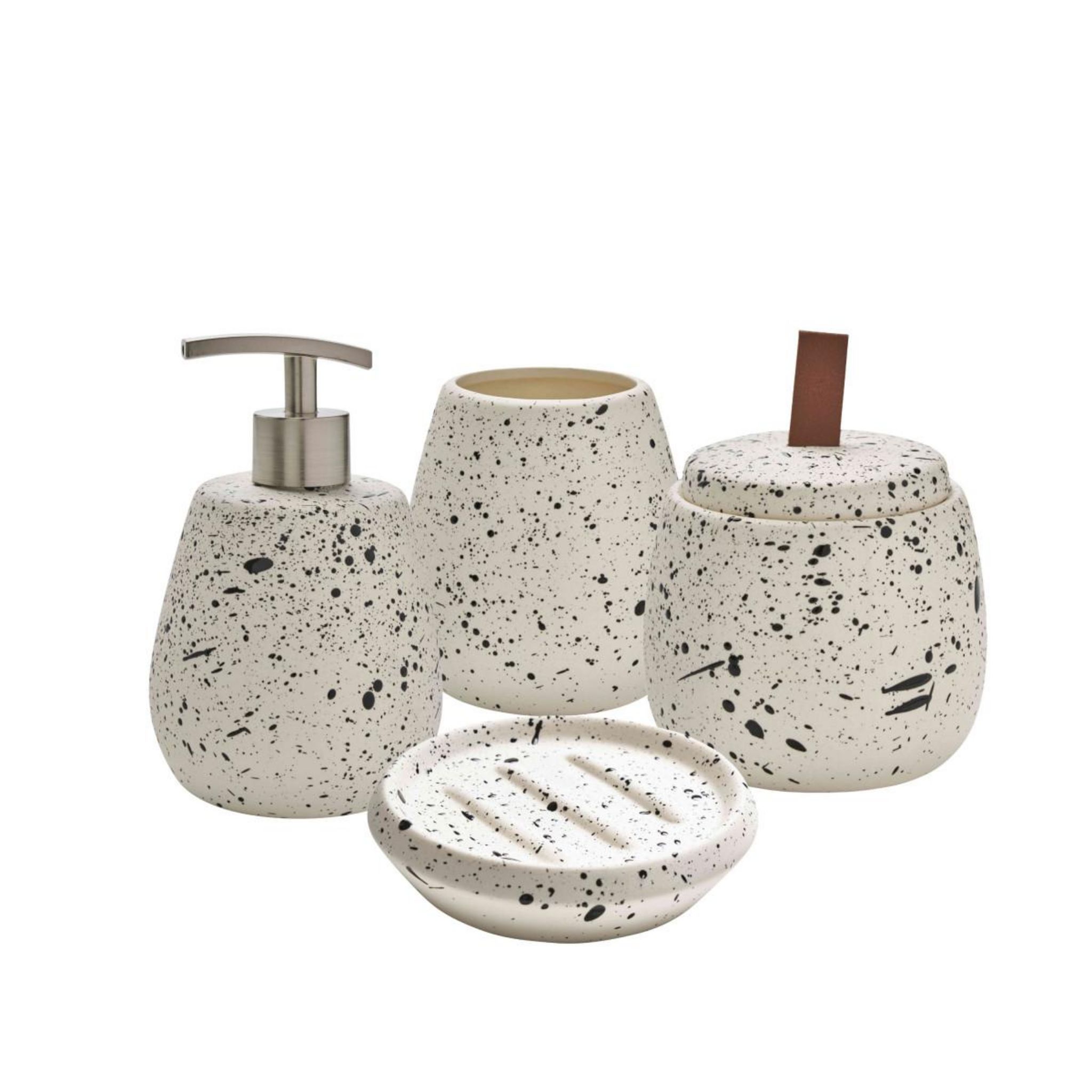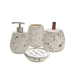 Ce produit est un ensemble d'accessoires de salle de bain au design moderne et élégant. Il se compose de quatre pièces assorties fabriquées en céramique avec un motif blanc moucheté de noir, peint à la main, rappelant un effet terrazzo ou peinture éclaboussée. L'ensemble comprend :