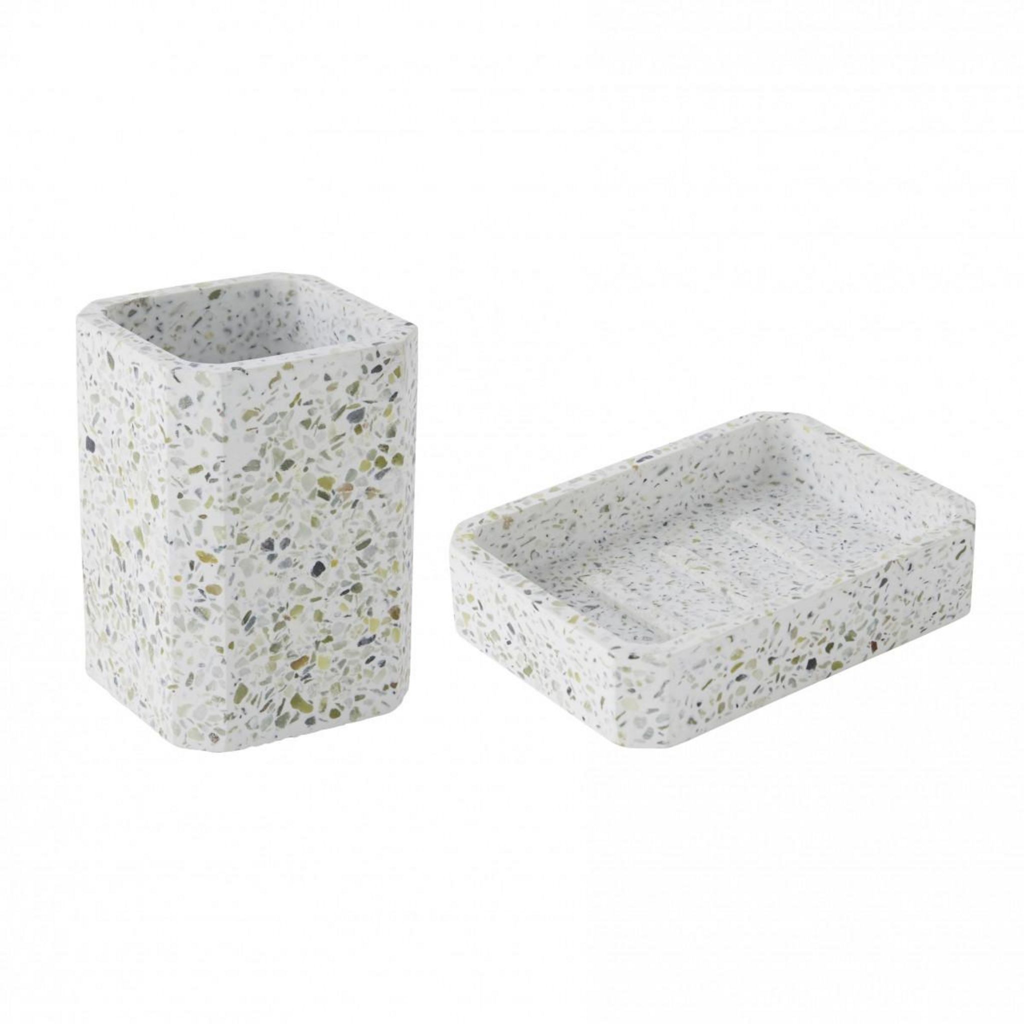 Ce set de salle de bain en polyrésine fait partie de la gamme TERRAZZO. Il contient un porte savon et un porte brosse à dents.
