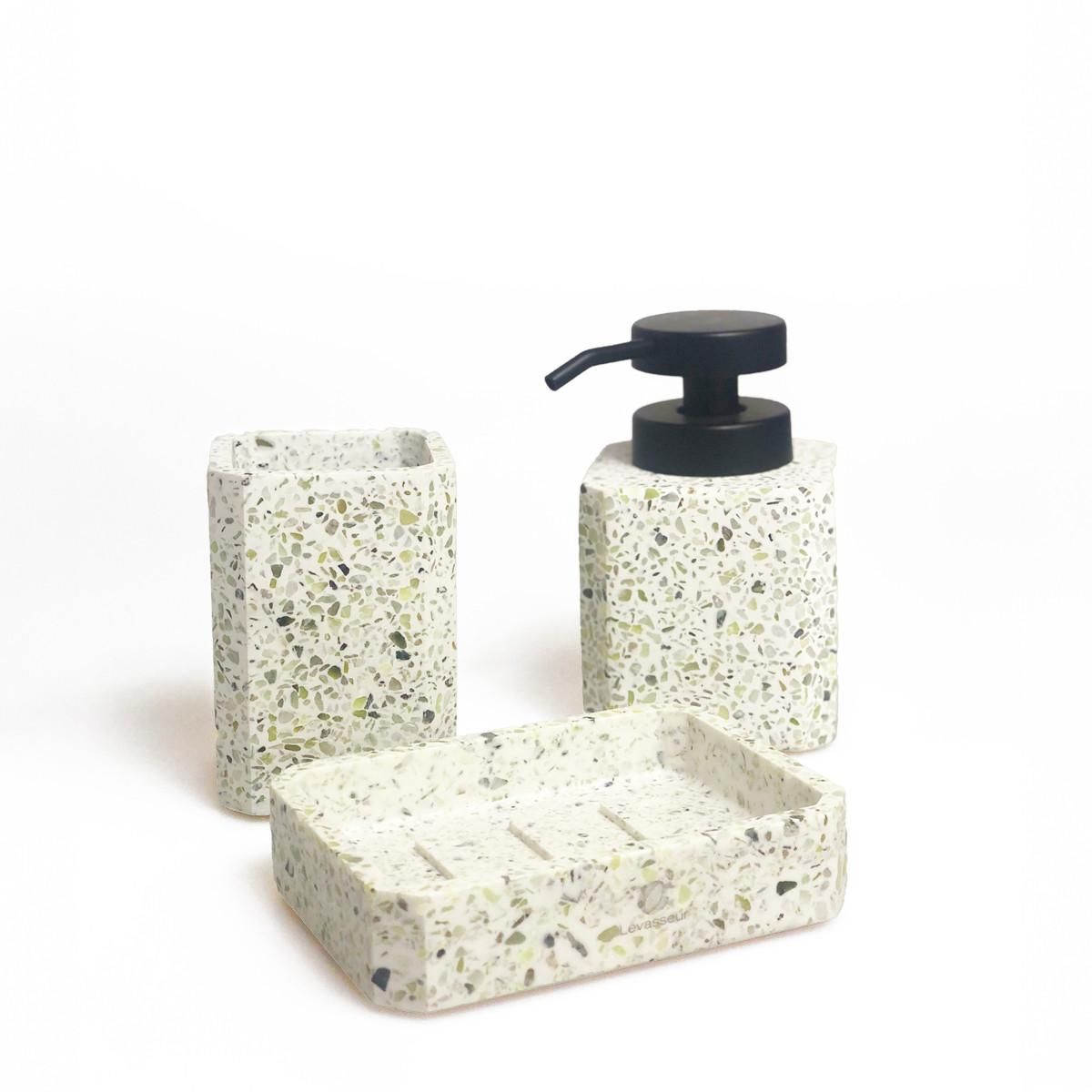 Ce set de salle de bain en polyrésine fait partie de la gamme TERRAZZO. Il contient un distributeur de savon, un porte savon et un porte brosse à dents.