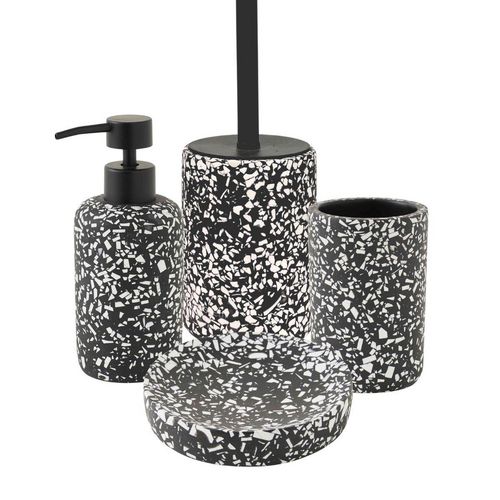 Set de salle de bain noir - TERRAZZO - LEVASSEURCe set de salle de bain en polyrésine, fait partie de la gamme TERRAZZO. Il contient un distributeur de savon, un porte savon, un porte brosse à dents et une brosse WC.Cette gamme est conçue pour transformer vos accessoires de salle de bains en objet d