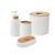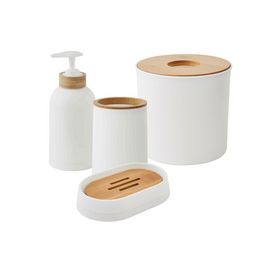 Ce set de salle de bain en plastique et bambou blanc ou noir, fait partie de la gamme PRIMA.Il contient un distributeur de savon, un porte savon, un porte brosse à dent et une poubelle à cotons.