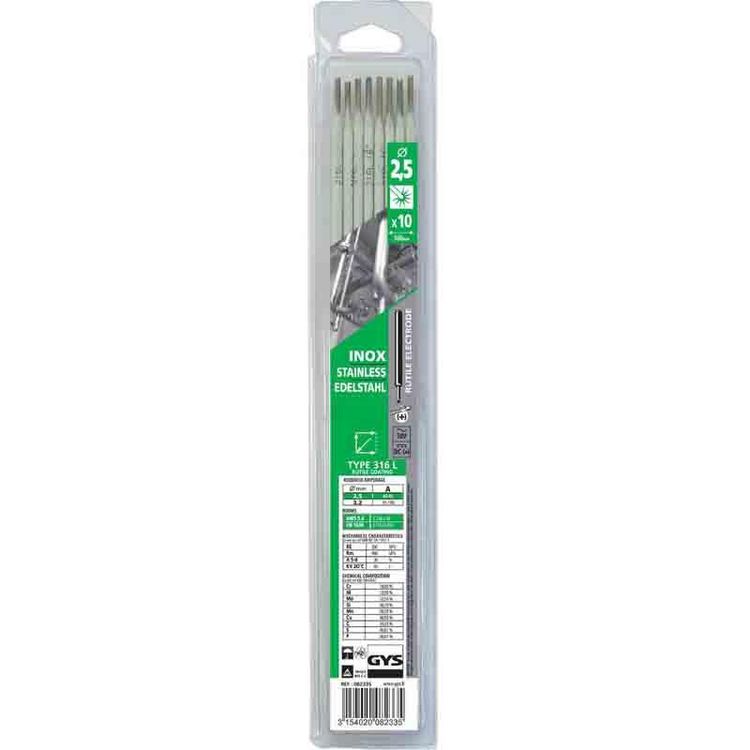 Soudage à l'arc d'aciers inoxydables (type 18/8). Applications : canalisations, tuyauteries, cuves... Propriétés : fusion douce et régulière. Cordon de bel aspect. Emploi : amorçage dès 50 V. Courant alternatif ou courant continu.Caractéristiques générales : Pce : 10Ø (mm) : 2,5Marque: Gys
