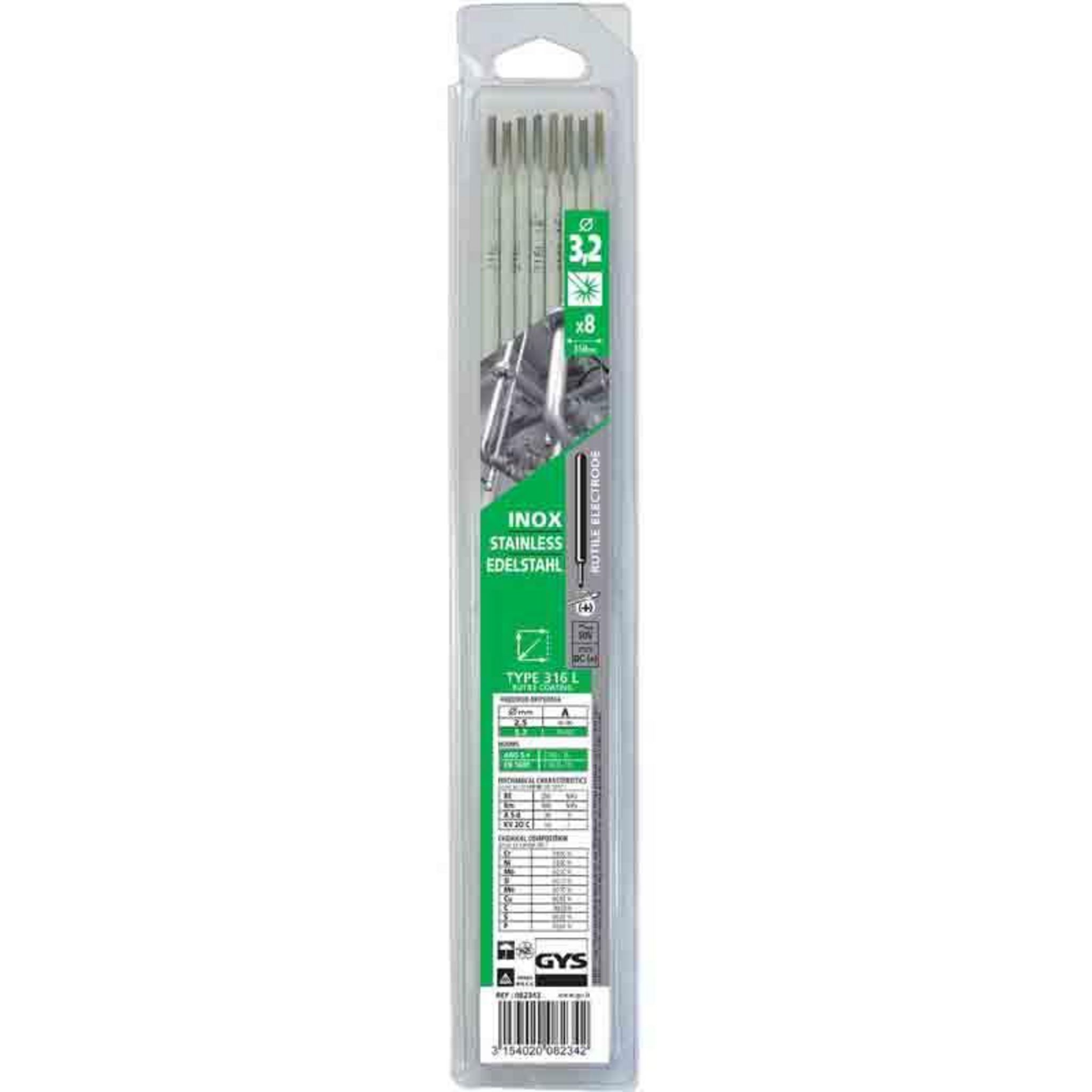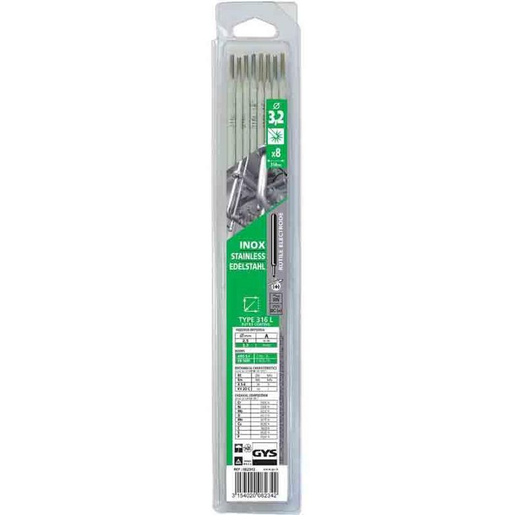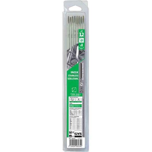 Soudage à l'arc d'aciers inoxydables (type 18/8). Applications : canalisations, tuyauteries, cuves... Propriétés : fusion douce et régulière. Cordon de bel aspect. Emploi : amorçage dès 50 V. Courant alternatif ou courant continu.Caractéristiques générales : Pce : 8Ø (mm) : 3,2Marque: Gys