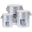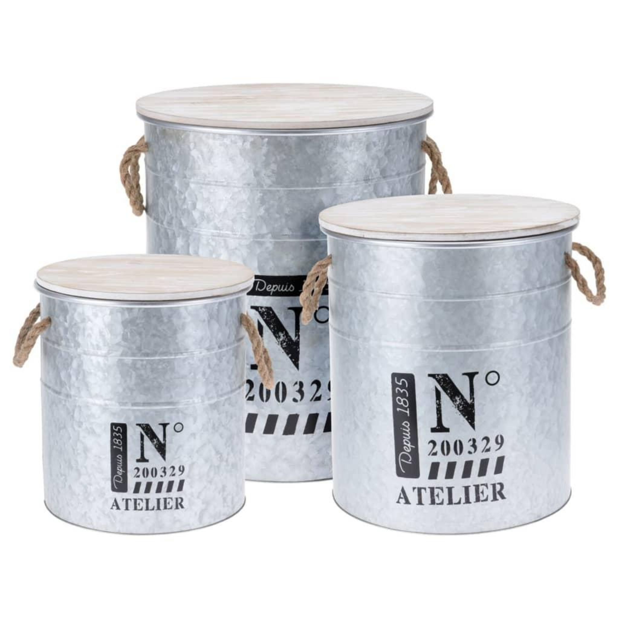 L'ensemble de boîtes de rangement de la marque H&S Collection se compose de trois boîtes de rangement menageres argentees de differentes tailles, fabriquees en zinc. Elles sont equipees de couvercles en bois blanc delave.