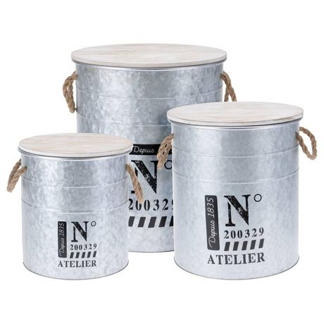 L'ensemble de boîtes de rangement de la marque H&S Collection se compose de trois boîtes de rangement menageres argentees de differentes tailles, fabriquees en zinc. Elles sont equipees de couvercles en bois blanc delave. Ces elegantes boîtes de rangement peuvent etre utilisees a differentes fins. V