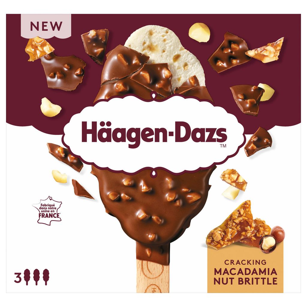 Laissez-vous tenter par nos bâtonnets de crème glacée à la vanille avec des confiseries aux éclats de noix de macadamia caramélisés, le tout enrobé d'une couche de chocolat au lait aux confiseries de noix de macadamia caramélisées. Cette glace est fabriquée en France, à Tilloy-lès-Mofflaines. Toutes nos glaces sont sans conservateur, ni colorant, ni arôme artificiel.