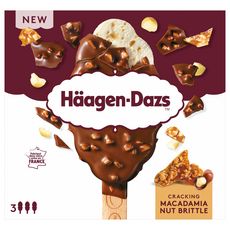 Crème glacée à la vanille avec confiseries (6,8%) aux noix de macadamia caramélisées et un enrobage au chocolat au lait et aux confiseries (4,3%) aux noix de macadamia caramélisées.
