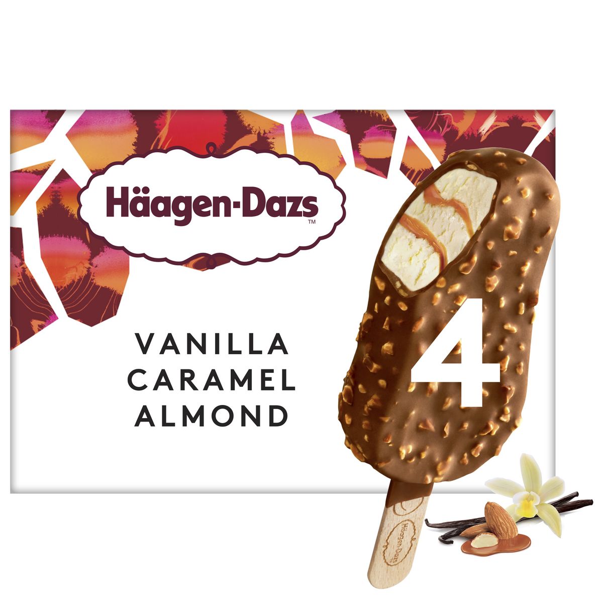 Sous un épais enrobage de chocolat au lait et d'amandes irrésistibles, se révèle une crème glacée à la vanille onctueuse et sa généreuse sauce au caramel.