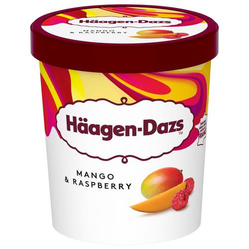 Crème glacée à la mangue et sauce à la framboise avec arômes naturels.