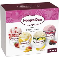Crème glacée Häagen-Dazs Fruit Collection en mini pots. Une collection fruitée composée de quatre parfums différents pour un moment rafraîchissant et savoureux. Fabriqué en France. Sans arômes artificiels ni colorants pour un plaisir ultime.