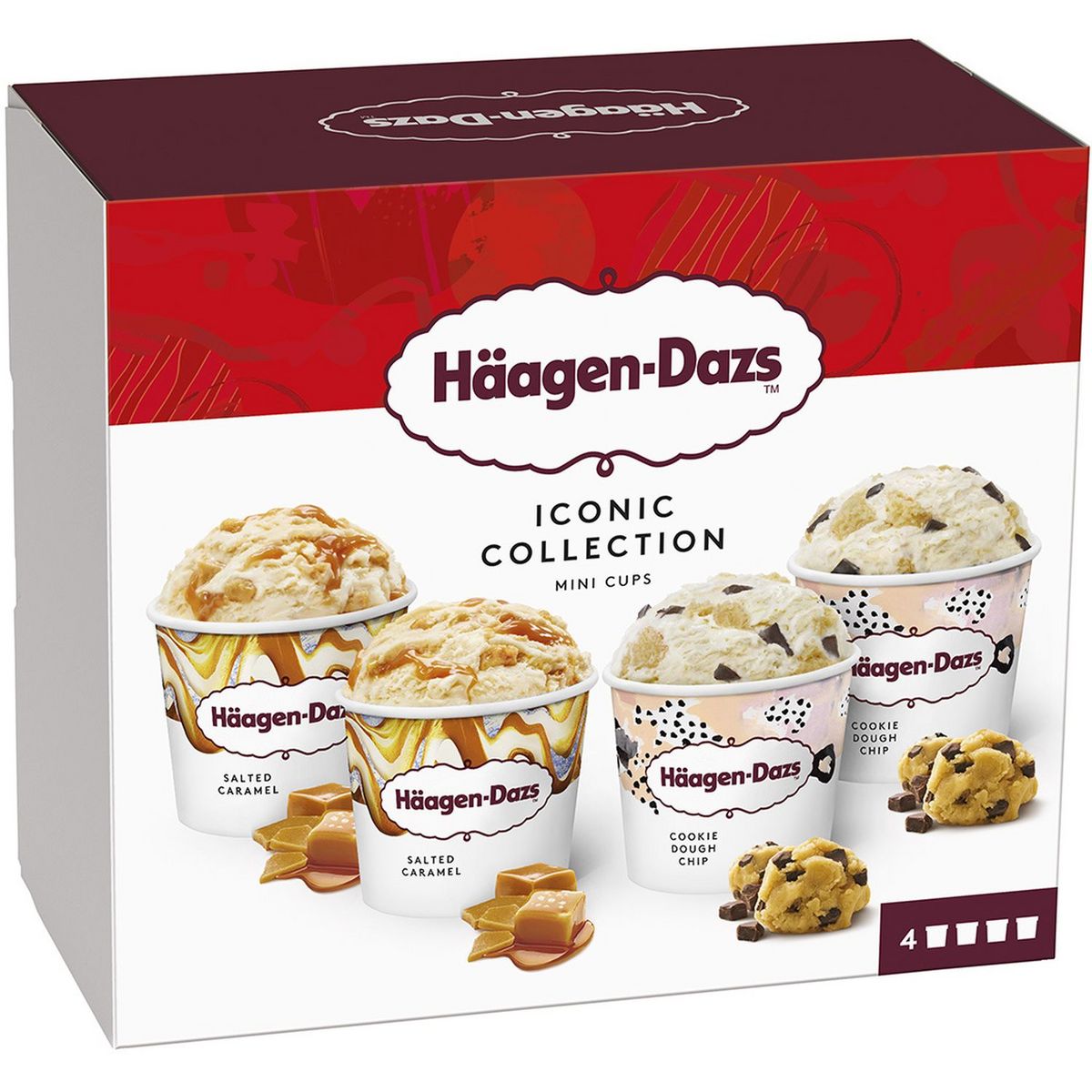Crème glacée Häagen-Dazs Iconic Collection en mini pots. Nos deux parfums iconiques Salted Caramel et Cookie Dough Chip, dans cette collection de minipots. Fabriqué en France. Sans arômes artificiels ni colorants pour un plaisir ultime. Iconic Collection : Salted Caramel : Crème glacée au caramel avec sauce caramel salé (10%) et éclats caramélisés salés (8%). Cookie Dough Chip : Crème glacée vanille avec morceaux de pâte à cookie (12%) et confiseries cacaotées (4%).