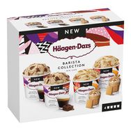 Crèmes glacées Häagen-Dazs Barista Collection Brownie Macchiato & Caramel Chai Latte en mini pots. Inspiré par la diversité des créations des cafés et réalisé avec la qualité Häagen-Dazs. 2 mini pots de crème glacée Brownie Macchiato : crème glacée au café Robusta doux avec une sauce café intense et de généreux morceaux de brownie au chocolat. 2 mini pots de crème glacée Chai Latte au caramel : mélange de Darjeeling et de crème glacée au thé noir Assam avec des extraits naturels de cardamome, cannelle et clous de girofle, sauce caramel au gingembre et morceaux de biscuit au beurre. Fabriqué en France. Sans arômes artificiels ni colorants, pour un plaisir ultime. Barista collection : Brownie Macchiato : Crème glacée au café avec une sauce au café (12%) et des morceaux de brownies (7.5%). Caramel Chai Latte : Crème glacée au thé noir et aux épices avec une sauce au caramel et au gingembre (12%) et des morceaux de biscuits (8%).