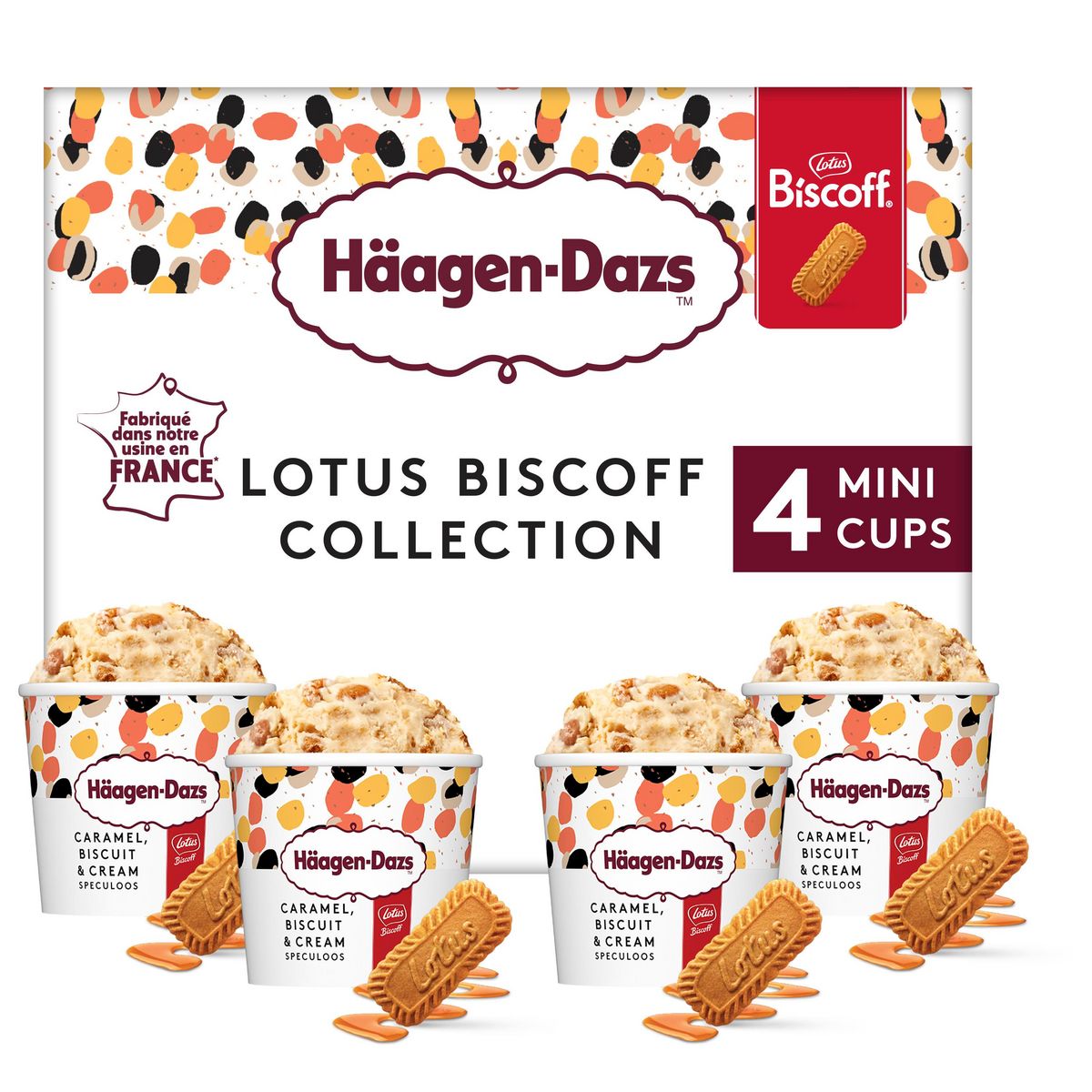 Laissez-vous tenter par notre sélection de crèmes glacées Caramel Biscuit & Cream Speculoos, constituée de 4 mini pots associant le caramel au croquant du speculoos. Ces glaces sont fabriquées en France, à Tilloy-lès-Mofflaines. Toutes nos glaces sont sans conservateur, ni colorant, ni arôme artificiel.