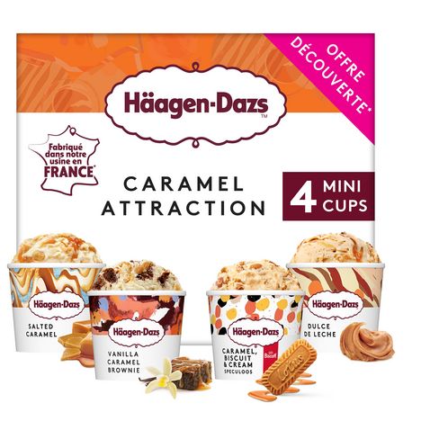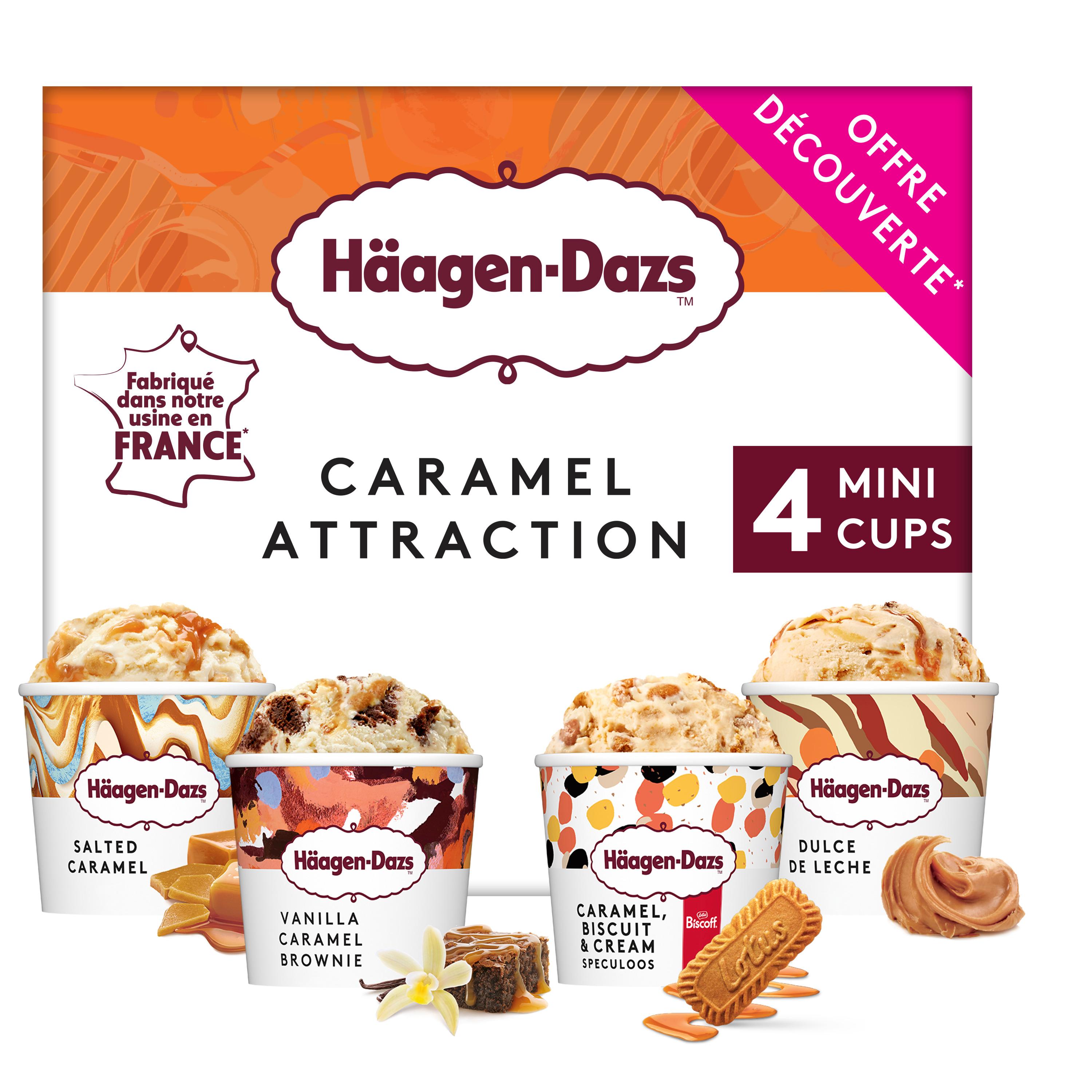 Laissez-vous tenter par notre collection de crèmes glacées Caramel Attraction constituée de 4 parfums caramélisés en mini pots : Caramel Salé, Vanille Caramel Brownie, Caramel Biscuit & Cream Speculoos, Dulce de Leche. Ces glaces sont fabriquées en France, à Tilloy-lès-Mofflaines. Toutes nos glaces sont sans conservateur, ni colorant, ni arôme artificiel. *Jusqu'à 5€ de réduction sur les produits Häagen-Dazs. Offre valable une seule fois par acte d'achat. Voir conditions sur le site haagen-dazs.fr/offre-découverte