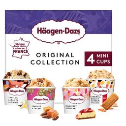 Laissez-vous tenter par notre sélection de crèmes glacées Original Collection constituée de 4 parfums incontournables en mini pots : Vanille Caramel Brownie, Pralines & Cream, Cheesecake à la fraise, Caramel Biscuit & Cream Ces glaces sont fabriquées en France, à Tilloy-lès-Mofflaines. Toutes nos glaces sont sans conservateur, ni colorant, ni arôme artificiel.