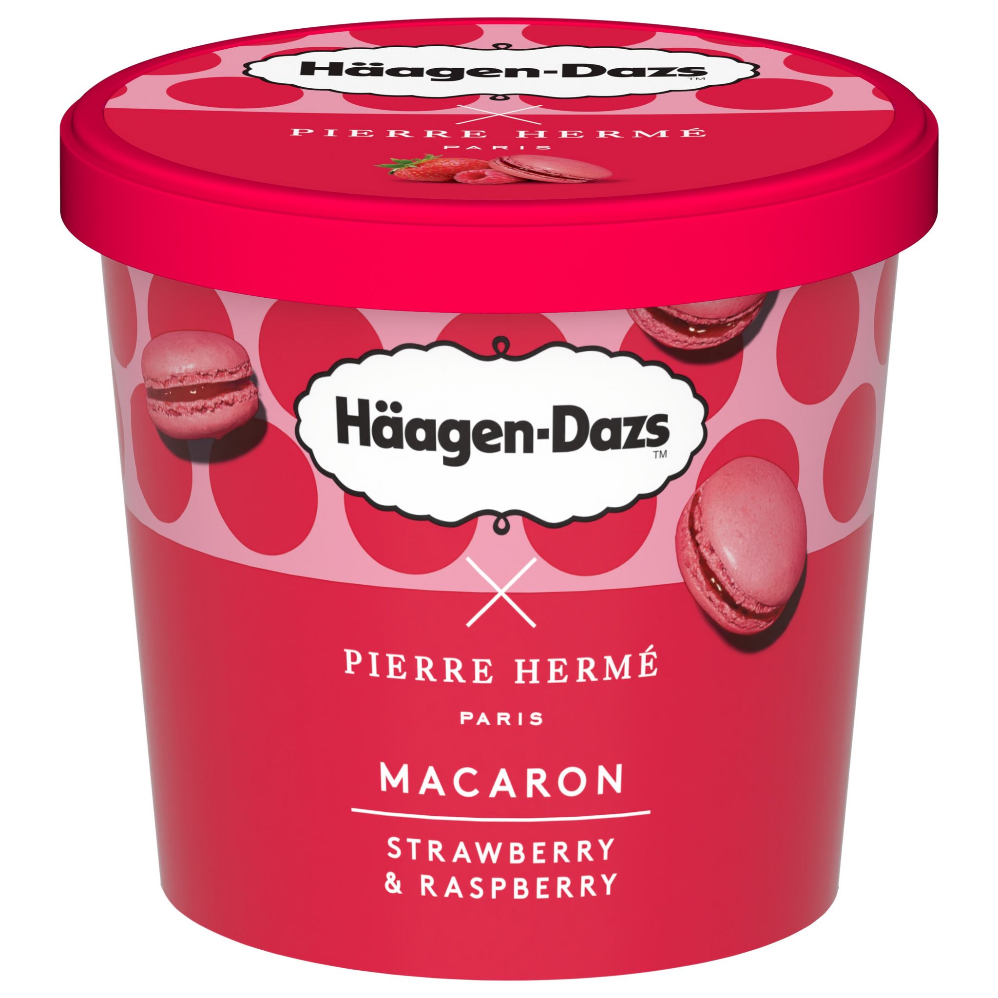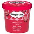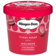 Crème glacée à la fraise et à la framboise avec une sauce à la framboise, et des morceaux de macarons (8%) colorés avec des concentrés de patate douce et carotte.