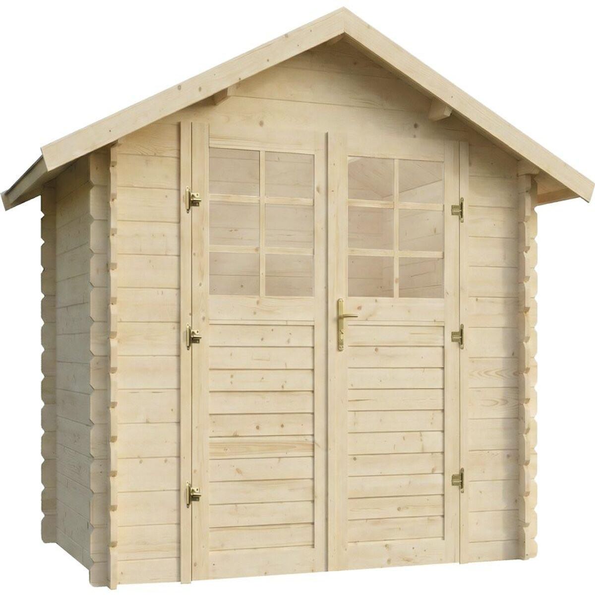 Abri de jardin avec double porte en bois Beaufort - 6.94 m² - 28 mmCet abri de jardin en bois est la solution idéale pour stocker votre matériel. Sa structure repose sur des parois épaisses de 28 mm offrant une stabilité et une résistance maximale face aux variations climatiques. L'accès est simplifié par une double porte semi-vitrée spacieuse, idéale pour manipuler sans encombre des objets volumineux comme une tondeuse ou des vélos, tout en profitant d'un apport de lumière naturelle à l'intérieur.L'agencement est optimisé avec une hauteur au faîtage de 218 cm qui facilite les mouvements et le stockage vertical. Il possède des dimensions hors tout de 287 x 241 cm (6.94 m²) pour une surface intérieure de 4.60 m² (214 x 214 cm), avec une emprise au sol extérieure de 5.66 m² (238 x 238 cm).Son toit en pente assure un drainage rapide des eaux de pluie, préservant ainsi la durabilité de la structure. Optimisez votre rangement extérieur avec l'abri de jardin Beaufort Abri de jardin avec toit en pente Beaufort - Dimensions hors tout : 287 x 241 x 218 cm - Surface hors tout : 6.94 m² - Surface intérieure : 4.60 m² - Surface extérieure : 5.66 m² - Bois - Epaisseur : 28 mm .Structure: bois