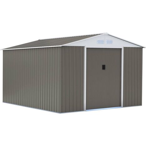 En savoir +Abri de jardin métal couleur taupe et blanc - Dimensions hors tout : L 3,82 x l 3,40 x 2,10 m - Kit d'ancrage sur béton inclus.