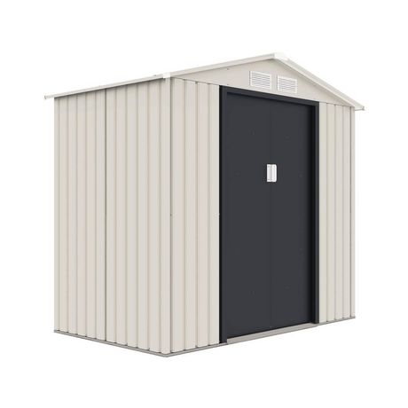 Abri de jardin métal  Nebraska  - 2.71 m² - Dimensions : 127 x 213 x 195 cm - Beige/gris anthracite - Structure : métal (zinc) - Dimensions extérieures : 117 x 203 x 195 cm - Dimensions intérieures : 113 x 199 x 195 cm - 2 portes coulissantes avec poignées (dimensions : 96 x 162 cm) - 4 évents - Kit