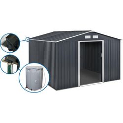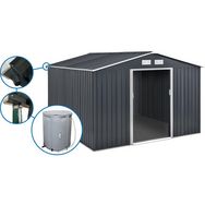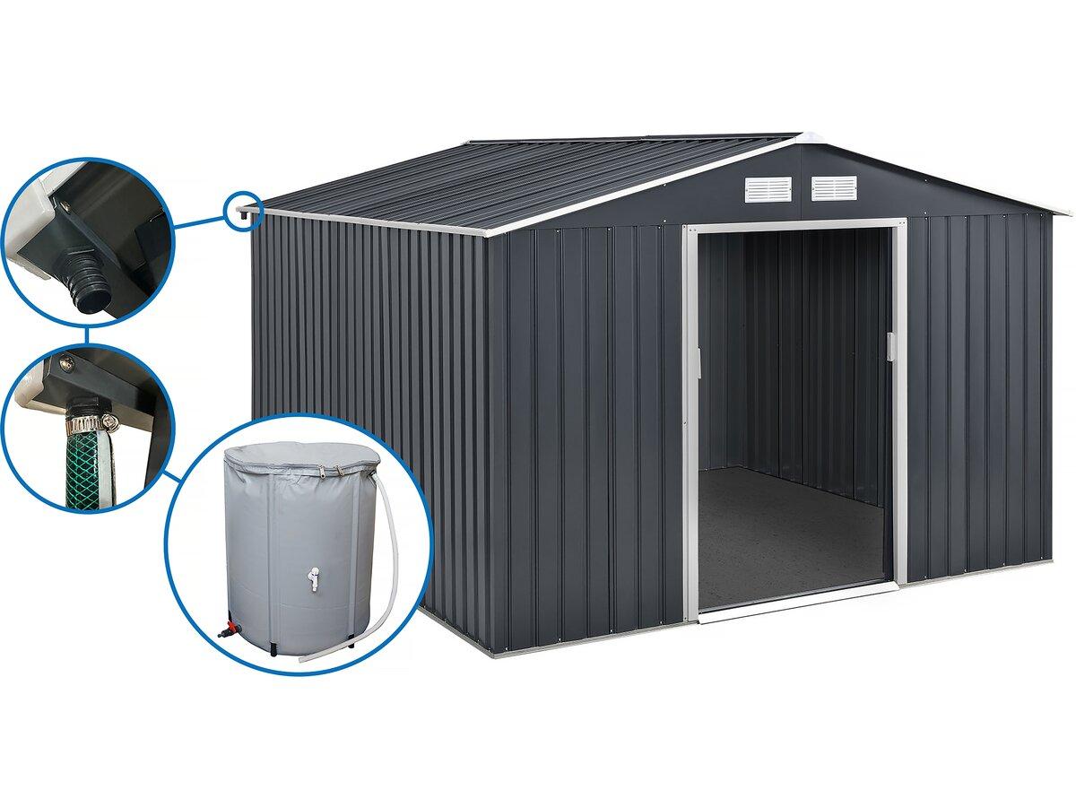 Abri de jardin Vegas - En acier galvanisé - Grilles d'aération - Résiste aux UV et à la rouille - Gris - gouttière pour abris de jardin en métal - Convient pour abri métal et garage métal de 6 m2 à 13 m2 - Récupérateur d'eau 250 L.Abri de jardin métal 12.98 m² avec gouttière et récupérateur d'eau -