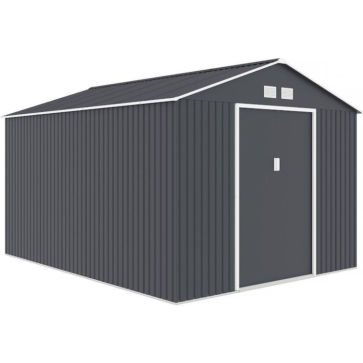 Abri de jardin Vegas - En acier galvanisé - Dimensions hors-tout : 446 x 340 x 210 cm - Grilles d'aération - Double porte coulissante - Résiste aux UV et à la rouille - Gris.