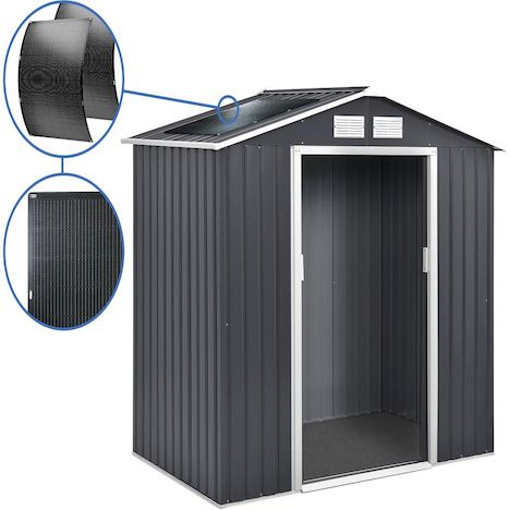 Abri de jardin métal 5.29 m² avec panneaux solaires - Vegas :Découvrez l'Abri de jardin métal Vegas , un espace de rangement pratique et durable pour votre jardin. Avec une surface totale de 5.29 m² et une structure renforcée en acier galvanisé, cet abri offre une solution de stockage fiable et résistante aux intempéries. Sa double porte coulissante facilite l'accès à vos outils et équipements, tandis que sa résistance aux UV et à la corrosion garantit sa longévité dans diverses conditions environnementales. En plus de son design pratique et robuste, l'Abri de jardin métal Végas est équipé d'un ensemble de panneaux solaires flexibles, ajoutant une dimension écologique à votre espace extérieur. Avec une puissance Pmax de 200W et une efficacité maximale de 97,10%, ces panneaux fournissent une source d'énergie renouvelable pour alimenter vos besoins électriques. La boîte de jonction IP67 et les câbles MC4 assurent une installation sûre et étanche, tandis que la garantie de 12 ans vous offre une tranquillité d'esprit quant à la performance à long terme de vos panneaux solaires.Offrant à la fois fonctionnalité et durabilité, l'Abri de jardin métal Vegas est l'ajout idéal à tout espace extérieur. Avec sa porte coulissante, ses quatre grilles d'aération et ses panneaux solaires intégrés, cet abri vous offre un espace de stockage polyvalent et écologique pour répondre à vos besoins en plein air. Abri de jardin métal - Surface 5.29 m² - Avec panneaux solaires - Lot de 2 - Onduleur wifi et prise courant inclus - Anti corrosion - Résistant - Pratique .Descriptif: - Structure renforcée en acier galvanisé