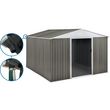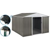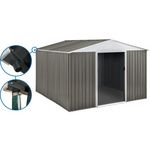 Abri de jardin métal - Couleurs gris/taupe et blanc - Dimensions hors tout 436 x 330 x 210 cm- Epaisseur des parois : 0,025 m - Structure haute qualité composée de zinc et d'acier - 2 portes coulissantes - 4 grilles d'aérations - gouttière.