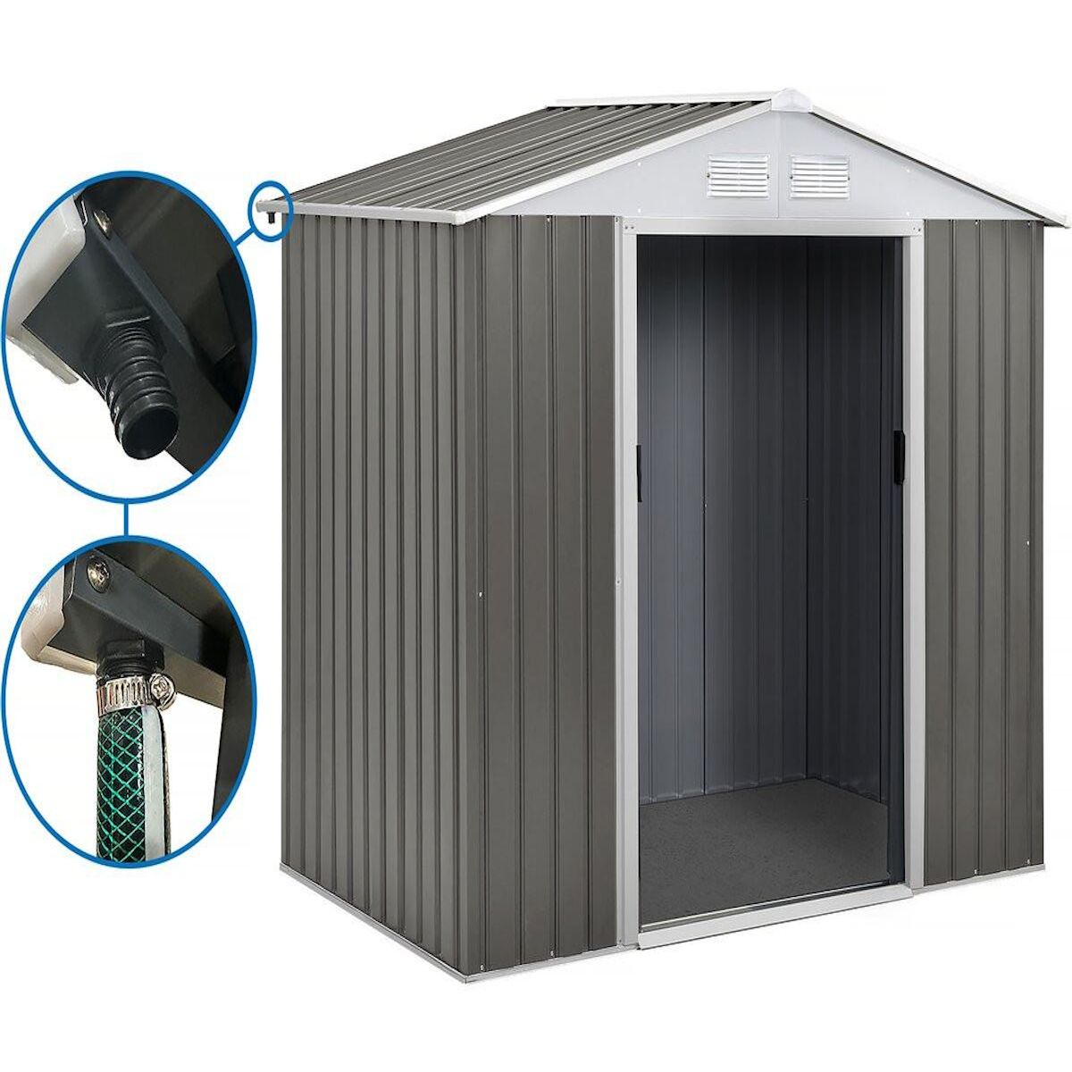 Abri jardin métal Dallas - 4.07 m² avec gouttièreDécouvrez l'Abri de Jardin Métal Dallas, une solution de rangement élégante et durable pour votre espace extérieur. Arborant des tons modernes de gris/taupe et blanc, cet abri offre un espace généreux avec des dimensions hors tout de 3,19 m x 3,4 m x 2,10 m, soit une superficie totale de 4.07m².Sa structure de haute qualité, fabriquée à partir de zinc et d'acier, garantit une résistance exceptionnelle aux intempéries et à l'usure. Les deux portes coulissantes facilitent l'accès à vos outils de jardinage et équipements.Doté de 4 grilles d'aération, cet abri assure une circulation d'air optimale pour protéger vos objets de la moisissure et de l'humidité. De plus, les gouttières intégrées permettent une gestion efficace des eaux pluviales, préservant ainsi la durabilité de votre abri et contribuant à la protection de l'environnement.Transformez votre jardin en un espace organisé et esthétique avec l'Abri de Jardin Métal Dallas. Commandez dès maintenant pour profiter d'une solution de rangement pratique et élégante. Abri de jardin métal - Couleurs gris/taupe et blanc - Dimensions hors tout 3,19 m x 3,4 m x 2,10 m- Epaisseur des parois : 0,025 m - Structure haute qualité composée de zinc et d'acier - 2 portes coulissantes - 4 grilles d'aérations - Gouttières .Descriptif: Véritable espace de rangement, l'abri de jardin métal << Dallas >> de très bonne qualité offre de nombreux avantages. Il vous sera utile aussi bien l'été que l'hiver et vous permettra d'entreposer outils ou mobilier de jardin (tondeuse, bricolage, bois, vélos, jeux d'enfants, peinture..). Son design et sa couleur s'adapteront parfaitement au décor du jardin durablement et cela quelque soit le climat.