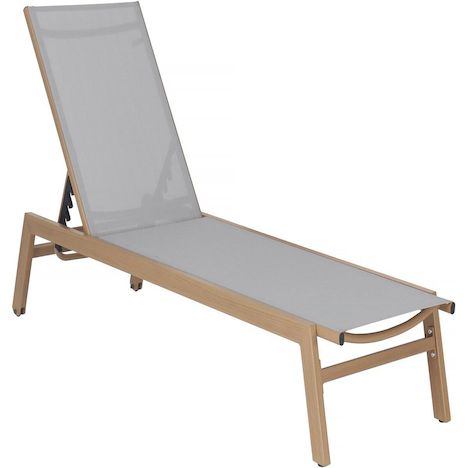 Bain de soleil en aluminium avec structure imitation bois l Elysia - Gris clair - Dimensions: 163 x 55 x 53/91 cm - Dossier inclinable: 5 positions.Bain de soleil en aluminium imitation bois Elysia - Gris clairLe bain de soleil en aluminium imitation bois Elysia est l'allié idéal pour profiter