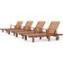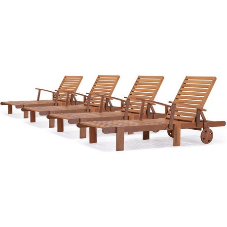 Descriptif : - Lot de 4 bains de soleil de jardin - Structure en bois naturel Shorea - Tablette latérale coulissante - Bain de soleil pliable - Dossier inclinable - 4 positions dossier - Roues de déplacement - Dimensions dossier : 56 x 64 cm - Hauteur dossier min/max : 30/80 cm - Dimensions siège : 57 x 117 x 26 cm - Hauteur d'assise : 26 cm - Dimensions tablette : 18 x 32 cm - Dimensions pieds : 2 x 9 x 26 cm.