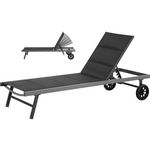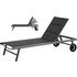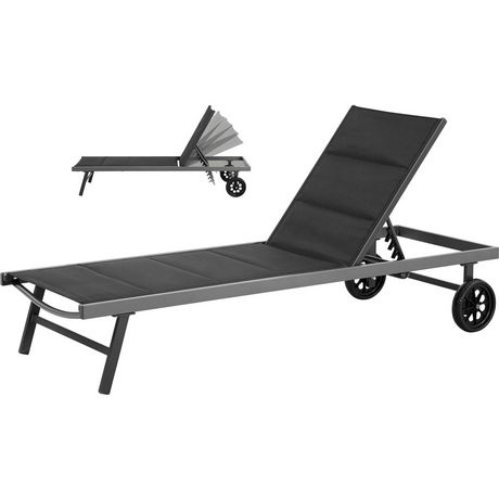 En savoir +Bain de soleil de jardin - Rembourré - 200 x 65 x 91 cm - Dossier inclinable - 5 positions - Structure en aluminium - Siège en textilène - Hauteur d'assise : 34 cm - 2 roues mobiles - Noir.