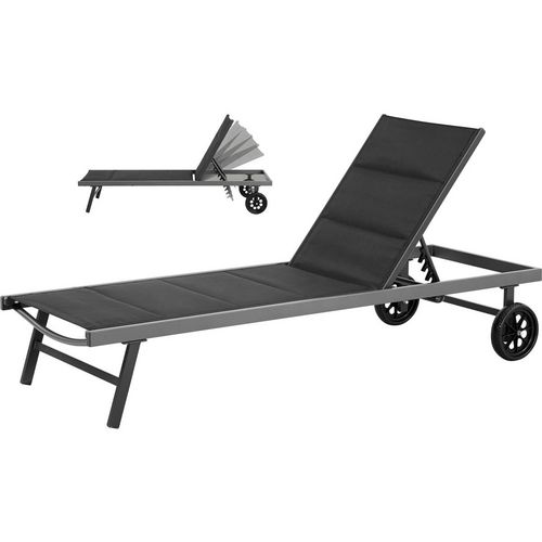 Bain de soleil de jardin - Rembourré - 200 x 65 x 91 cm - Dossier inclinable - 5 positions - Structure en aluminium - Siège en textilène - Hauteur d'assise : 34 cm - 2 roues mobiles - Noir.Le confort des journées d'été Place à la détente avec le bain de soleil Bella! Synonyme de bien-être et de repo