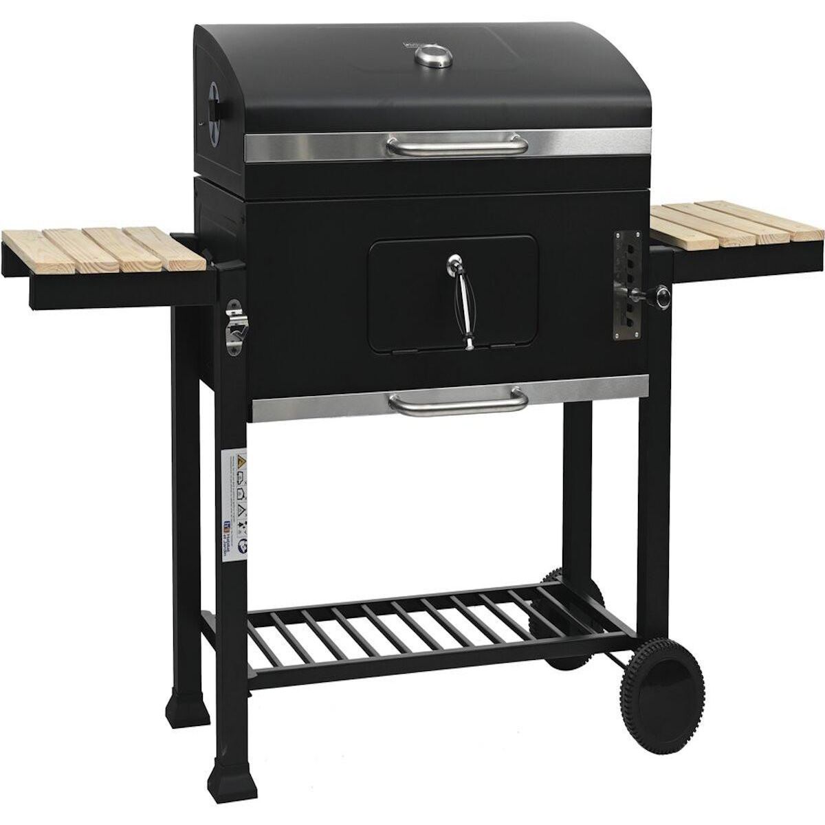Barbecue avec chariot en métal Marquis - 160 x 56 x 108 cm - NoirDécouvrez le barbecue carré Marquis , l'équipement haut de gamme indispensable pour sublimer vos espaces extérieurs. Alliant robustesse et élégance avec sa structure en métal noir, il offre un espace de cuisson généreux grâce à son brasero de 85 x 46 cm.Ce modèle se distingue par sa maîtrise parfaite de la chaleur : son couvercle est doté d'un thermomètre intégré pour surveiller vos cuissons avec précision. Pour un confort total, il dispose de deux tablettes latérales en bois, idéales pour garder vos plats et ustensiles à portée de main.Véritable cuisine nomade, il se déplace sans effort grâce à ses deux roues intégrées. Sa trappe frontale et sa manivelle de réglage de hauteur du foyer permettent de gérer les braises en toute sécurité. Performant et esthétique, le barbecue Marquis transforme chaque grillade en un moment d'exception. Barbecue à charbon de bois Marquis - Noir - Métal - Dimensions : 160 x 56 x 108 cm - Grilles réglables en hauteur - Hauteur de cuisson : 85 cm - 2 tablettes latérales - 2 roues intégrées - Thermomètre intégré .Descriptif: Barbecue à charbon - Noir - Métal - Dimensions : 160 x 56 x 108 cm - Hauteur de cuisson : 85 cm - 2 tablettes latérales - 2 roues intégrées - Thermomètre intégré