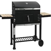 Barbecue à charbon de bois Marquis - Noir - Métal - Dimensions : 160 x 56 x 108 cm - Grilles réglables en hauteur - Hauteur de cuisson : 85 cm - 2 tablettes latérales - 2 roues intégrées - Thermomètre intégré.