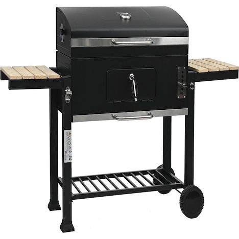 Barbecue à charbon de bois Marquis - Noir - Métal - Dimensions : 160 x 56 x 108 cm - Grilles réglables en hauteur - Hauteur de cuisson : 85 cm - 2 tablettes latérales - 2 roues intégrées - Thermomètre intégré.Barbecue avec chariot en métal Marquis - 160 x 56 x 108 cm - NoirDécouvrez le barbecue