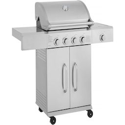 Barbecue à gaz avec 4 brûleurs dont 1 latéral Brazzo - 118 x 57 x 104 cm - Gris clairLe barbecue à gaz Brazzo est conçu pour les amateurs de cuisine en plein air et de grillades. Il est équipé de 4 brûleurs principaux et d'un brûleur latéral, offrant une puissance totale de 14,5 kW pour une cuisson rapide et homogène.La surface de cuisson barbecue de 35 x 41 cm permet de griller viandes, légumes et autres ingrédients, tandis que la surface plancha de 23 x 41 cm est idéale pour les poissons, fruits de mer et légumes délicats. Cette double surface permet de cuisiner plusieurs plats en même temps.Fabriqué en métal résistant et doté d'un coloris gris clair, ce barbecue est à la fois robuste et moderne. Il dispose également d'un rangement intégré pratique pour vos ustensiles, d'un couvercle pour protéger la cuisson et maintenir la chaleur, et de roulettes pour un déplacement facile. Ce barbecue allie praticité, performance et convivialité pour les repas en famille ou entre amis.Barbecue en inox à gaz 5 brûleurs Brazzo - Surface de cuisson grille : 35 x 41 cm - Surface de cuisson plancha : 23 x 41 cm - Puissance : 14,5 kW - Métal - Gris clair .Descriptif: Barbecue à gaz 4 brûleurs avec 1 brûleur latéral Brazzo - Surface de cuisson BBQ : 35 x 41 cm - Surface de cuisson plancha : 23 x 41 cm - Puissance : 14,5 kW - Métal - Gris clair