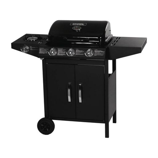 Barbecue gaz 4 brûleurs : 3 brûleurs 7.2 kW + 1 brûleur latéral 3.3 kW- Surface de cuisson : 52 x 36 cm - Structure en acier - Grilles acier émaillé - plaque cuisson fonte - Bac récupérateur de graisse amovible - 2 roues de déplacement - Tuyau et détendeur non fournis.