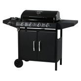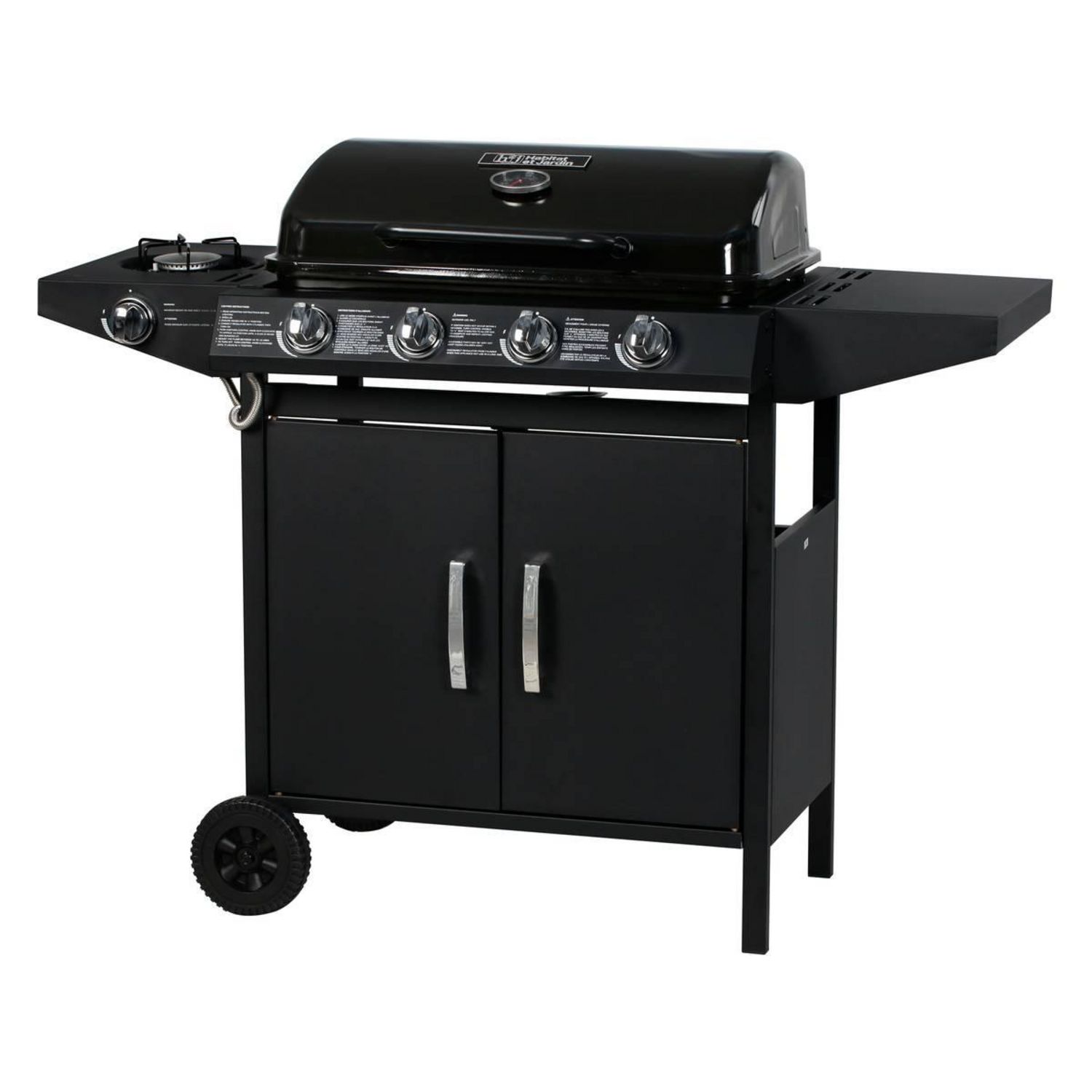 Barbecue gaz 5 brûleurs : 4 brûleurs 9.6 kW + 1 brûleur latéral 3.3kW - Surface de cuisson : 64 x 37 cm - Structure en acier - Grilles acier émaillé - Plaque cuisson fonte - Bac récupérateur de graisse amovible - 2 roues de déplacement - Tuyau et détendeur non fournis.Le barbecue au gaz Très pratiqu