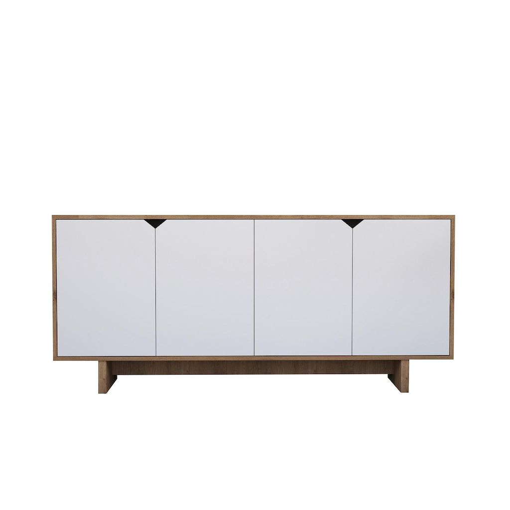 Buffet en bois - Dimensions : 180 x 40 x 81 cm - Fixation murale possible - 4 portes - 4 étagères - Blanc.