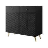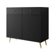 Bahut Temerra 100 x 42 x 92 cm - Noir stratifié - 2 portes - 4 étagères - 2 tiroirs - 4 pieds en acier de coloris dorée.