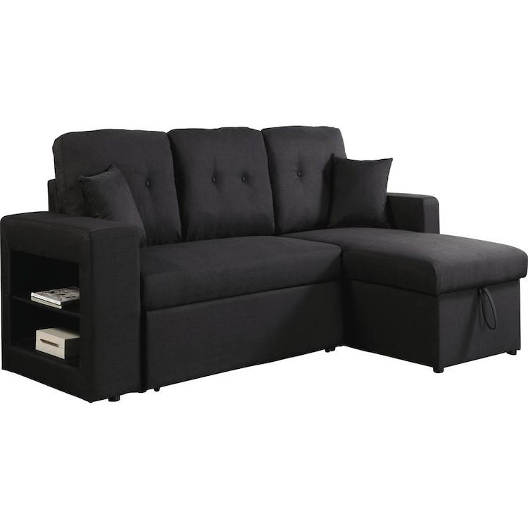 Canapé d'angle convertible Axel - Canapé: 233 x 146 x 86 cm - Couchage: 192 x 136 x 44 cm - Lin - Noir - Espace de stockage (méridienne) + étagère.