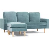 En savoir +Canapé d'angle à méridienne réversible Gabby - 3 places - Bleu - Dimensions : 194 x 75 x 84 cm - Style scandinave - En velours - Structure en bois d'Eucalyptus et contreplaqué.