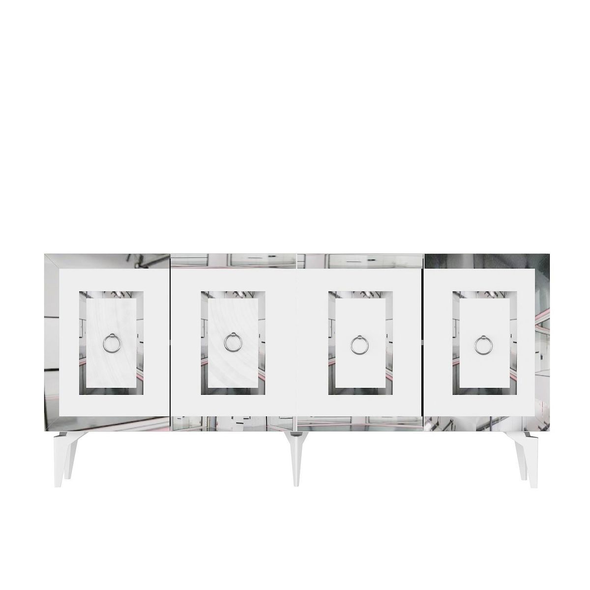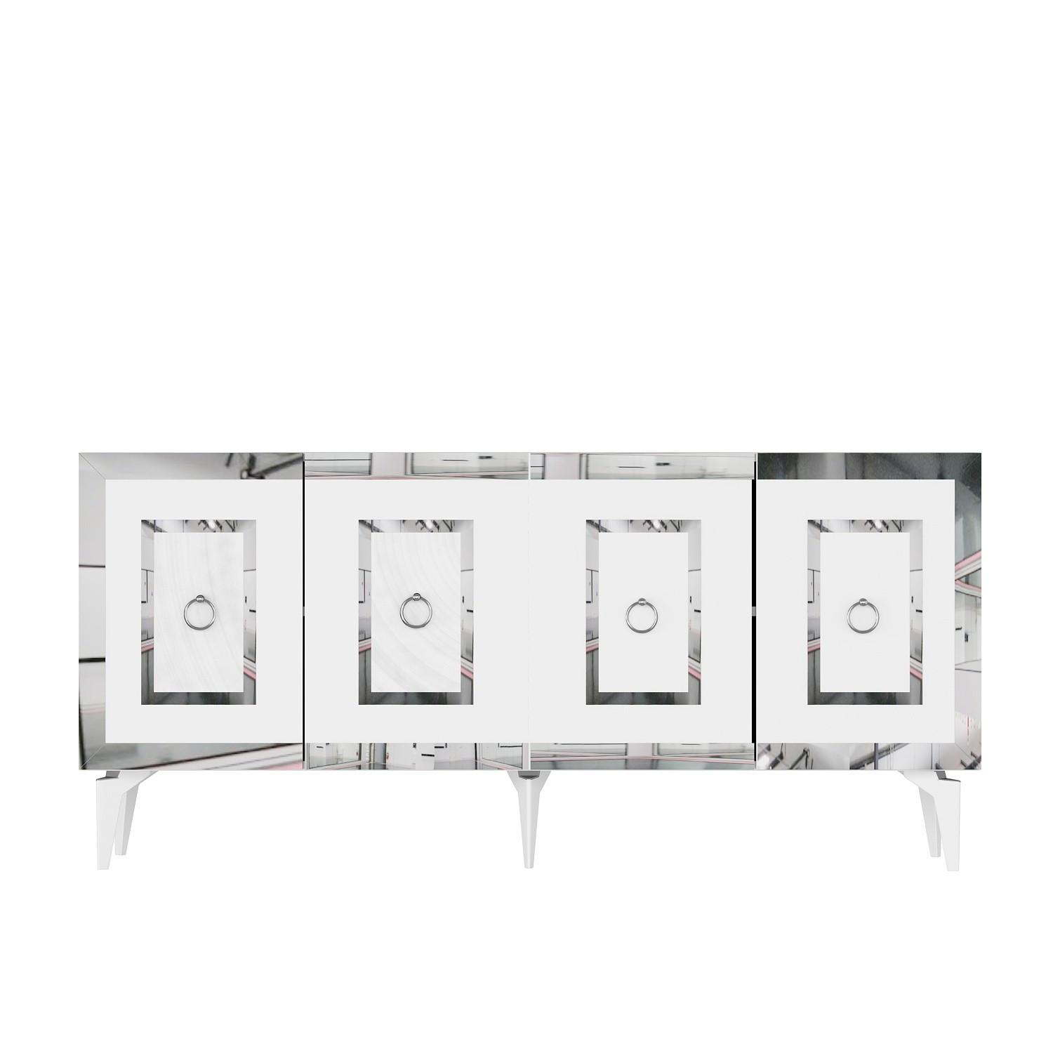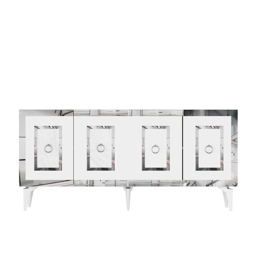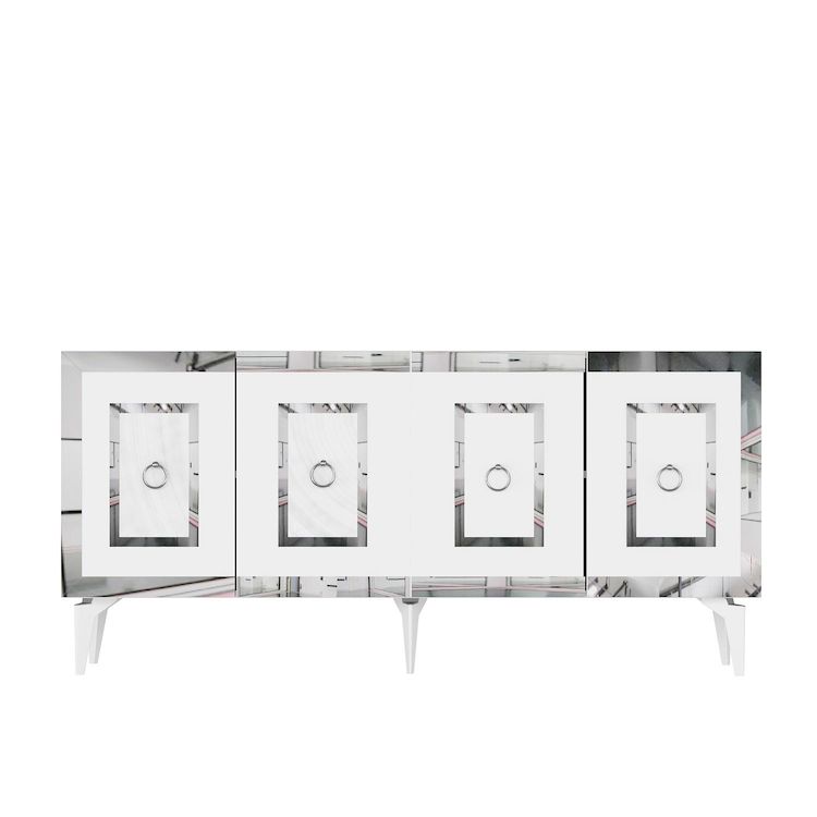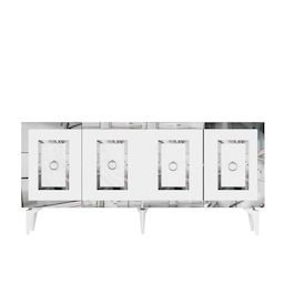 Console en bois Karya - 79 x 150 x 40 cm - Blanc, Argent – 1 étagères, 4 portes, couleur blanc, argent.