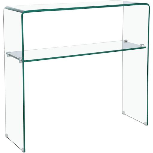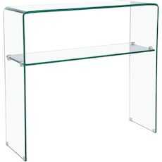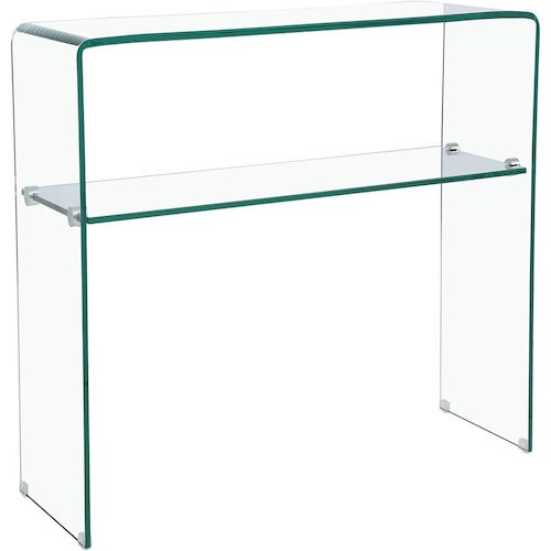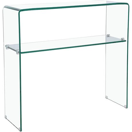 Quant à son plateau supérieur, ce dernier peut supporter une charge jusqu'à 100 kg. Grâce à son design, vous mettrez facilement en valeur un vase de fleurs, une plante, un ou plusieurs cadres photos, une sculpture etc...Descriptif : - Console pour salon et séjour - En verre trempé courbé - Transparent - Pour une pièce claire et lumineuse - Un mobilier au design moderne - Pratique : plateau supérieur et niche de rangement .
