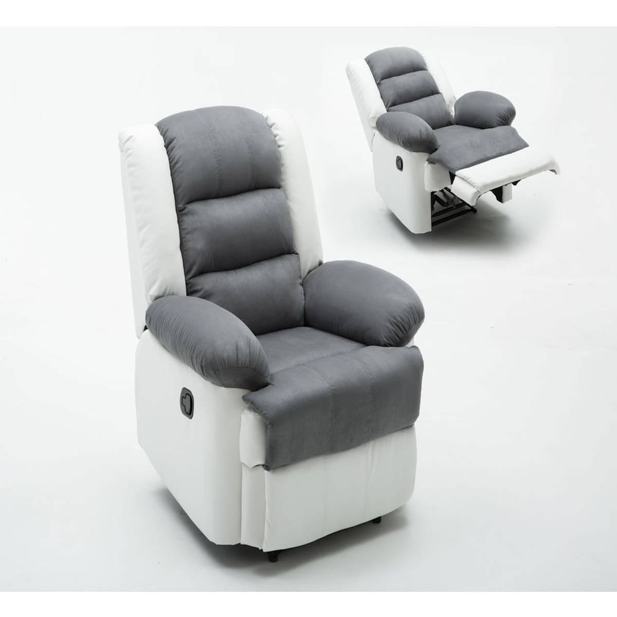 Fauteuil relax Buckingham Un fauteuil de relaxationAccordez-vous un instant de détente ! Le fauteuil relax Buckingham a tout pour vous plaire : une assise accueillante, un dossier inclinable, un repose-pied...Il trouve naturellement sa place dans votre salon pour que vous puissiez vous y installer confortablement après une longue journée. Vous pourrez aussi le placer dans un bureau : rien de mieux qu'un fauteuil relax pour travailler à la maison et ainsi lier l'utile à l'agréable ! Une assise moelleuseLe fauteuil Buckingham est doté d'une assise agréablement rembourrée. Garni de mousse et de mousse recyclée, ce fauteuil propose une assise moelleuse des plus accueillantes. D'une densité allant de 18 à 24 kg/m³ pour la mousse et d'une densité de 50 kg/m³ pour la mousse recyclée, le fauteuil relax Buckingham est idéal pour les amateurs d'assises moelleuses. Un dossier inclinableAvec le fauteuil Buckingham, vous aurez la possibilité d'incliner le dossier. Selon vos envies, vous pourrez choisir parmi 3 positions différentes et trouver celle qui vous convient le mieux ! Pour regarder la TV, pour lire ou pour faire une sieste, passez d'une activité à une autre aussitôt ! Un repose-pied tout confortPour améliorer votre installation dans le fauteuil, n'hésitez pas à utiliser son repose-pied !Relevable, vous pourrez y reposer vos jambes pour un moment de relaxation et de bien-être optimal.Pour les jambes lourdes comme pour les jambes fatiguées, étendre vos pieds vous procurera une sensation de confort immédiate ! Fauteuil relax Buckingham - Blanc / Gris clair - Dimensions : 85 x 93 x 100 cm - En PU - Dossier inclinable - Repose-pied relevable - 3 positions d'inclinaison possibles - Mécanisme : manette sur le côté - Garnis de mousse et mousse recyclée - Hauteur d'assise : 50 cm .Sans Titre: Polyuréthane