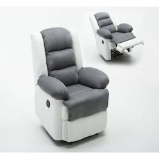 En savoir +Fauteuil relax Buckingham - Blanc / Gris clair - Dimensions : 85 x 93 x 100 cm - En PU - Dossier inclinable - Repose-pied relevable - 3 positions d'inclinaison possibles - Mécanisme : manette sur le côté - Garnis de mousse et mousse recyclée - Hauteur d'assise : 50 cm.