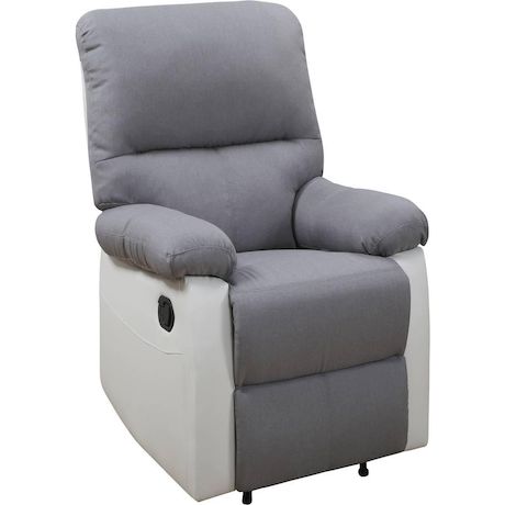 Fauteuil relax Lincoln Avec le fauteuil relax Lincoln, se relaxer est à portée de main ! Le fauteuil relax est un incontournable en matière de mobilier de salon. Il se révèle parfait pour lire un bouquin, s'installer devant un écran plat ou pour, tout simplement, se relaxer. Doté d'un rembourrage en mousse et en polyester d'une densité de 25 kg/m³, il vous offrira un confort apprécié et recherché et vous permettra de vous détendre tranquillement depuis votre salon. Par ailleurs, une poignée située sur le côté de l'assise vous donnera la possibilité d'incliner manuellement le fauteuil et, ainsi, d'enclencher le mode relax . Fauteuil relax Lincoln - Inclinable - Blanc / Gris clair - Dimensions : 90 x 89 x 103 cm - Revêtement en tissu et PU - Rembourrage mousse .Sans Titre: tissu polyester