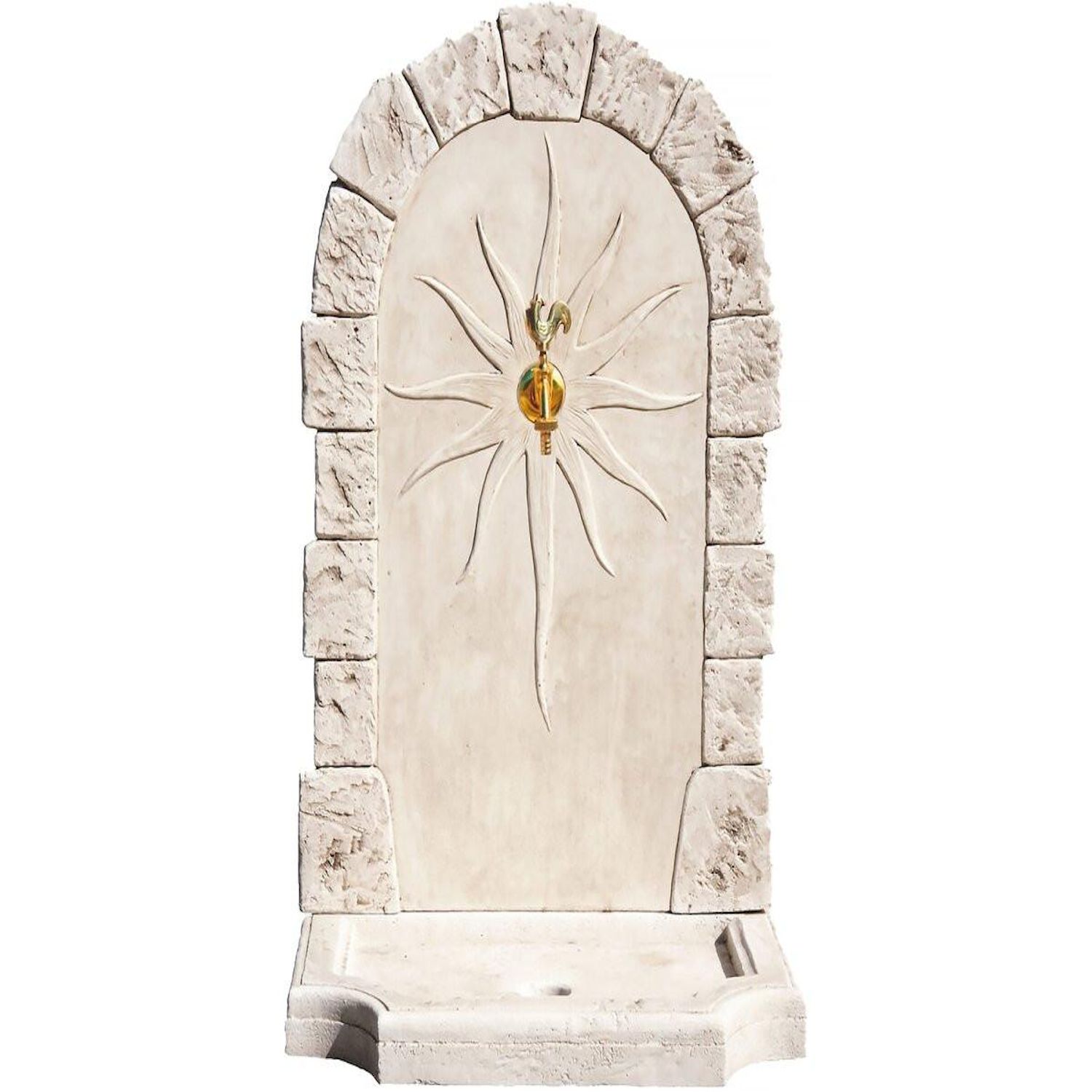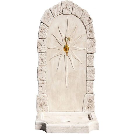 Fontaine Calypso Nous vous proposons la fontaine murale en pierre reconstituée Calypso.Idéal pour la décoration de votre jardin, ce matériau est très résistant aux conditions extérieures telles que la pluie, le gel ainsi qu'aux autres intempériesElle est composée d'un réceptacle avec trou d'évacuation et d'un fronton.Fontaine Calypso - 0.62 x 0.40 x 0.93 m - En pierre reconstituée imitant à la perfection l'aspect de la pierre naturelle. .Description: Vendue avec un robinet en laiton.L'entraxe du trou du robinet se trouvant dans le fronton est à 57 cm du sol. Le réceptacle (plaque) fait 7 cm d'épaisseur. La hauteur du fronton fait 86 cm.